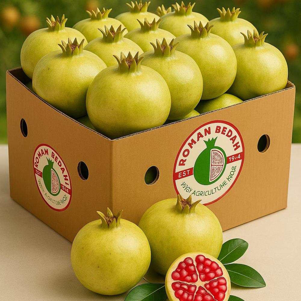 المنتج: رمان الباحة- المصدر: منطقة الباحة- التعبئة: كرتون- الوزن: من 18 إلى 20 كيلوجرام- حجم الرمان: متوسط إلى كبير- عدد الحبات: حوالي 36 حبة